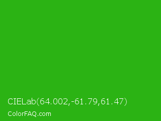 CIELab 64.002,-61.79,61.47 Color is a normal green color and the nearest color is Slimy Green #299617. Hex code #2bb314 and RGB value is rgb(43,179,20). In RGB color space, this color is composed of 17% red, 70% green, 8% blue, In CMYK color space, this color is composed of 76% cyan, 0% magenta, 89% yellow , 30% black , In HSL color space, this color has a hue angle of 111° , 80% saturation and 39% lightness.