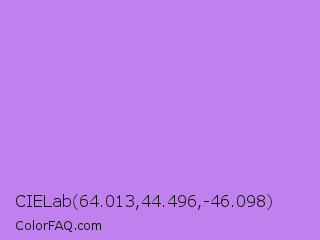 CIELab 64.013,44.496,-46.098 Color is a light purple color and the nearest color is Lavender #b57edc. Hex code #c080ee and RGB value is rgb(192,128,238). In RGB color space, this color is composed of 75% red, 50% green, 93% blue, In CMYK color space, this color is composed of 19% cyan, 46% magenta, 0% yellow , 7% black , In HSL color space, this color has a hue angle of 275° , 76% saturation and 72% lightness.