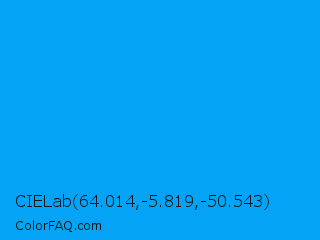 CIELab 64.014,-5.819,-50.543 Color is a normal blue color and the nearest color is Vivid Cerulean #00aaee. Hex code #05a3f5 and RGB value is rgb(5,163,245). In RGB color space, this color is composed of 2% red, 64% green, 96% blue, In CMYK color space, this color is composed of 98% cyan, 33% magenta, 0% yellow , 4% black , In HSL color space, this color has a hue angle of 201° , 96% saturation and 49% lightness.