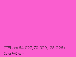 CIELab 64.027,70.929,-28.226 Color is a light magenta color and the nearest color is Light Deep Pink #ff5ccd. Hex code #fa5ecf and RGB value is rgb(250,94,207). In RGB color space, this color is composed of 98% red, 37% green, 81% blue, In CMYK color space, this color is composed of 0% cyan, 62% magenta, 17% yellow , 2% black , In HSL color space, this color has a hue angle of 317° , 94% saturation and 67% lightness.