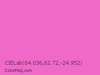 CIELab 64.036,62.72,-24.952 Color is a light magenta color and the nearest color is Rose Pink #ff66cc. Hex code #f069c9 and RGB value is rgb(240,105,201). In RGB color space, this color is composed of 94% red, 41% green, 79% blue, In CMYK color space, this color is composed of 0% cyan, 56% magenta, 16% yellow , 6% black , In HSL color space, this color has a hue angle of 317° , 82% saturation and 68% lightness.