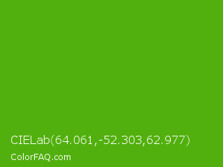 CIELab 64.061,-52.303,62.977 Color is a normal green color and the nearest color is Kelly Green #4cbb17. Hex code #52b00e and RGB value is rgb(82,176,14). In RGB color space, this color is composed of 32% red, 69% green, 5% blue, In CMYK color space, this color is composed of 53% cyan, 0% magenta, 92% yellow , 31% black , In HSL color space, this color has a hue angle of 95° , 85% saturation and 37% lightness.