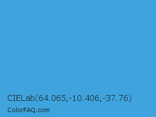 CIELab 64.065,-10.406,-37.76 Color is a normal blue color and the nearest color is Picton Blue #45b1e8. Hex code #3fa4de and RGB value is rgb(63,164,222). In RGB color space, this color is composed of 25% red, 64% green, 87% blue, In CMYK color space, this color is composed of 72% cyan, 26% magenta, 0% yellow , 13% black , In HSL color space, this color has a hue angle of 202° , 71% saturation and 56% lightness.