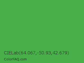 CIELab 64.067,-50.93,42.679 Color is a normal green color and the nearest color is Apple #4fa83d. Hex code #47b04a and RGB value is rgb(71,176,74). In RGB color space, this color is composed of 28% red, 69% green, 29% blue, In CMYK color space, this color is composed of 60% cyan, 0% magenta, 58% yellow , 31% black , In HSL color space, this color has a hue angle of 122° , 43% saturation and 48% lightness.