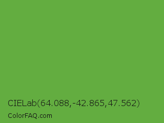 CIELab 64.088,-42.865,47.562 Color is a normal green color and the nearest color is Green RYB #66b032. Hex code #63ad40 and RGB value is rgb(99,173,64). In RGB color space, this color is composed of 39% red, 68% green, 25% blue, In CMYK color space, this color is composed of 43% cyan, 0% magenta, 63% yellow , 32% black , In HSL color space, this color has a hue angle of 101° , 46% saturation and 46% lightness.