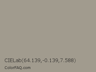 CIELab 64.139,-0.139,7.588 Color is a normal orange color and the nearest color is Zorba #a59b91. Hex code #a19b8e and RGB value is rgb(161,155,142). In RGB color space, this color is composed of 63% red, 61% green, 56% blue, In CMYK color space, this color is composed of 0% cyan, 4% magenta, 12% yellow , 37% black , In HSL color space, this color has a hue angle of 41° , 9% saturation and 59% lightness.