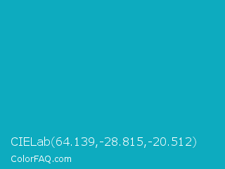 CIELab 64.139,-28.815,-20.512 Color is a normal cyan color and the nearest color is Pacific Blue #1ca9c9. Hex code #0dabbf and RGB value is rgb(13,171,191). In RGB color space, this color is composed of 5% red, 67% green, 75% blue, In CMYK color space, this color is composed of 93% cyan, 10% magenta, 0% yellow , 25% black , In HSL color space, this color has a hue angle of 187° , 87% saturation and 40% lightness.