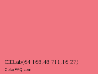 CIELab 64.168,48.711,16.27 Color is a light red color and the nearest color is Froly #f57584. Hex code #f17581 and RGB value is rgb(241,117,129). In RGB color space, this color is composed of 95% red, 46% green, 51% blue, In CMYK color space, this color is composed of 0% cyan, 51% magenta, 46% yellow , 5% black , In HSL color space, this color has a hue angle of 354° , 82% saturation and 70% lightness.