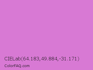 CIELab 64.183,49.884,-31.171 Color is a light magenta color and the nearest color is French Mauve #d473d4. Hex code #d879d4 and RGB value is rgb(216,121,212). In RGB color space, this color is composed of 85% red, 47% green, 83% blue, In CMYK color space, this color is composed of 0% cyan, 44% magenta, 2% yellow , 15% black , In HSL color space, this color has a hue angle of 303° , 55% saturation and 66% lightness.