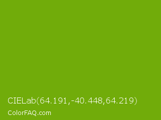 CIELab 64.191,-40.448,64.219 Color is a normal green color and the nearest color is Christi #67a712. Hex code #71ac0a and RGB value is rgb(113,172,10). In RGB color space, this color is composed of 44% red, 67% green, 4% blue, In CMYK color space, this color is composed of 34% cyan, 0% magenta, 94% yellow , 33% black , In HSL color space, this color has a hue angle of 82° , 89% saturation and 36% lightness.