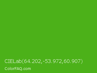 CIELab 64.202,-53.972,60.907 Color is a normal green color and the nearest color is Kelly Green #4cbb17. Hex code #4cb119 and RGB value is rgb(76,177,25). In RGB color space, this color is composed of 30% red, 69% green, 10% blue, In CMYK color space, this color is composed of 57% cyan, 0% magenta, 86% yellow , 31% black , In HSL color space, this color has a hue angle of 100° , 75% saturation and 40% lightness.