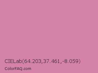 CIELab 64.203,37.461,-8.059 Color is a light rose color and the nearest color is Middle Purple #d982b5. Hex code #d582ab and RGB value is rgb(213,130,171). In RGB color space, this color is composed of 84% red, 51% green, 67% blue, In CMYK color space, this color is composed of 0% cyan, 39% magenta, 20% yellow , 16% black , In HSL color space, this color has a hue angle of 330° , 50% saturation and 67% lightness.