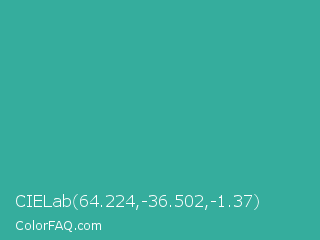 CIELab 64.224,-36.502,-1.37 Color is a normal cyan color and the nearest color is Keppel #3ab09e. Hex code #35ad9d and RGB value is rgb(53,173,157). In RGB color space, this color is composed of 21% red, 68% green, 62% blue, In CMYK color space, this color is composed of 69% cyan, 0% magenta, 9% yellow , 32% black , In HSL color space, this color has a hue angle of 172° , 53% saturation and 44% lightness.
