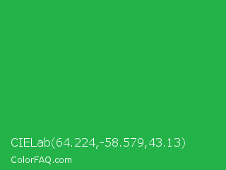 CIELab 64.224,-58.579,43.13 Color is a normal green color and the nearest color is Wageningen Green #34b233. Hex code #23b349 and RGB value is rgb(35,179,73). In RGB color space, this color is composed of 14% red, 70% green, 29% blue, In CMYK color space, this color is composed of 80% cyan, 0% magenta, 59% yellow , 30% black , In HSL color space, this color has a hue angle of 136° , 67% saturation and 42% lightness.