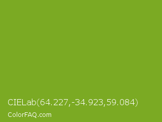 CIELab 64.227,-34.923,59.084 Color is a normal green color and the nearest color is Lima #76bd17. Hex code #7baa23 and RGB value is rgb(123,170,35). In RGB color space, this color is composed of 48% red, 67% green, 14% blue, In CMYK color space, this color is composed of 28% cyan, 0% magenta, 79% yellow , 33% black , In HSL color space, this color has a hue angle of 81° , 66% saturation and 40% lightness.