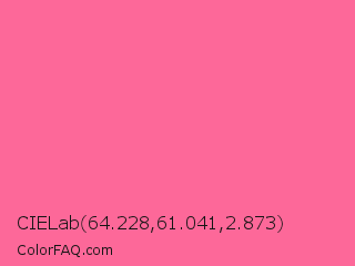CIELab 64.228,61.041,2.873 Color is a light rose color and the nearest color is French Pink #fd6c9e. Hex code #fd6899 and RGB value is rgb(253,104,153). In RGB color space, this color is composed of 99% red, 41% green, 60% blue, In CMYK color space, this color is composed of 0% cyan, 59% magenta, 40% yellow , 1% black , In HSL color space, this color has a hue angle of 340° , 97% saturation and 70% lightness.