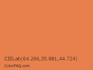 CIELab 64.266,35.881,44.724 Color is a light orange color and the nearest color is Burnt Sienna #e97451. Hex code #e8804d and RGB value is rgb(232,128,77). In RGB color space, this color is composed of 91% red, 50% green, 30% blue, In CMYK color space, this color is composed of 0% cyan, 45% magenta, 67% yellow , 9% black , In HSL color space, this color has a hue angle of 20° , 77% saturation and 61% lightness.