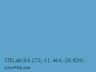 CIELab 64.273,-11.464,-26.829 Color is a normal blue color and the nearest color is Carolina Blue #56a0d3. Hex code #5ca4cb and RGB value is rgb(92,164,203). In RGB color space, this color is composed of 36% red, 64% green, 80% blue, In CMYK color space, this color is composed of 55% cyan, 19% magenta, 0% yellow , 20% black , In HSL color space, this color has a hue angle of 201° , 52% saturation and 58% lightness.