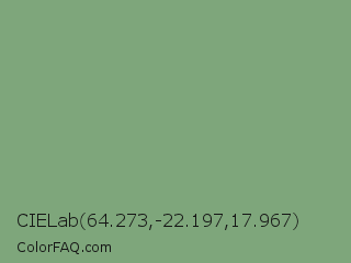 CIELab 64.273,-22.197,17.967 Color is a normal green color and the nearest color is Amulet #7b9f80. Hex code #7ea67b and RGB value is rgb(126,166,123). In RGB color space, this color is composed of 49% red, 65% green, 48% blue, In CMYK color space, this color is composed of 24% cyan, 0% magenta, 26% yellow , 35% black , In HSL color space, this color has a hue angle of 116° , 19% saturation and 57% lightness.