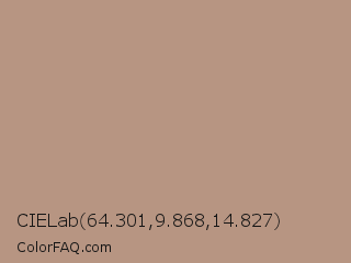 CIELab 64.301,9.868,14.827 Color is a light orange color and the nearest color is Pale Taupe #bc987e. Hex code #b79582 and RGB value is rgb(183,149,130). In RGB color space, this color is composed of 72% red, 58% green, 51% blue, In CMYK color space, this color is composed of 0% cyan, 19% magenta, 29% yellow , 28% black , In HSL color space, this color has a hue angle of 22° , 27% saturation and 61% lightness.