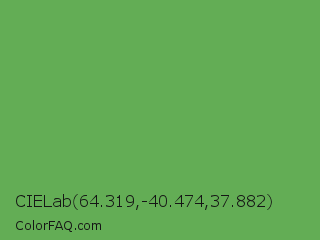 CIELab 64.319,-40.474,37.882 Color is a normal green color and the nearest color is Fern #63b76c. Hex code #63ad55 and RGB value is rgb(99,173,85). In RGB color space, this color is composed of 39% red, 68% green, 33% blue, In CMYK color space, this color is composed of 43% cyan, 0% magenta, 51% yellow , 32% black , In HSL color space, this color has a hue angle of 110° , 35% saturation and 51% lightness.