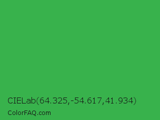 CIELab 64.325,-54.617,41.934 Color is a normal green color and the nearest color is Chateau Green #40a860. Hex code #38b24c and RGB value is rgb(56,178,76). In RGB color space, this color is composed of 22% red, 70% green, 30% blue, In CMYK color space, this color is composed of 69% cyan, 0% magenta, 57% yellow , 30% black , In HSL color space, this color has a hue angle of 130° , 52% saturation and 46% lightness.