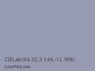 CIELab 64.32,3.144,-11.908 Color is a light blue color and the nearest color is Manatee #979aaa. Hex code #979bb1 and RGB value is rgb(151,155,177). In RGB color space, this color is composed of 59% red, 61% green, 69% blue, In CMYK color space, this color is composed of 15% cyan, 12% magenta, 0% yellow , 31% black , In HSL color space, this color has a hue angle of 231° , 14% saturation and 64% lightness.