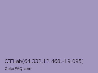 CIELab 64.332,12.468,-19.095 Color is a light indigo color and the nearest color is Amethyst Smoke #a397b4. Hex code #a296be and RGB value is rgb(162,150,190). In RGB color space, this color is composed of 64% red, 59% green, 75% blue, In CMYK color space, this color is composed of 15% cyan, 21% magenta, 0% yellow , 25% black , In HSL color space, this color has a hue angle of 258° , 24% saturation and 67% lightness.