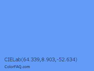 CIELab 64.339,8.903,-52.634 Color is a light blue color and the nearest color is Cornflower Blue #6495ed. Hex code #619cfa and RGB value is rgb(97,156,250). In RGB color space, this color is composed of 38% red, 61% green, 98% blue, In CMYK color space, this color is composed of 61% cyan, 38% magenta, 0% yellow , 2% black , In HSL color space, this color has a hue angle of 217° , 94% saturation and 68% lightness.