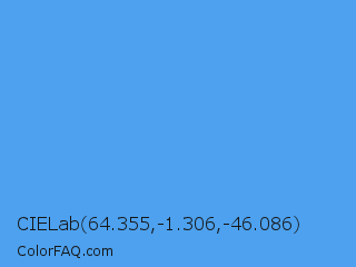 CIELab 64.355,-1.306,-46.086 Color is a light blue color and the nearest color is Picton Blue #45b1e8. Hex code #4da1ee and RGB value is rgb(77,161,238). In RGB color space, this color is composed of 30% red, 63% green, 93% blue, In CMYK color space, this color is composed of 68% cyan, 32% magenta, 0% yellow , 7% black , In HSL color space, this color has a hue angle of 209° , 83% saturation and 62% lightness.