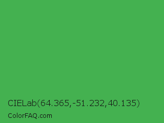 CIELab 64.365,-51.232,40.135 Color is a normal green color and the nearest color is Chateau Green #40a860. Hex code #44b150 and RGB value is rgb(68,177,80). In RGB color space, this color is composed of 27% red, 69% green, 31% blue, In CMYK color space, this color is composed of 62% cyan, 0% magenta, 55% yellow , 31% black , In HSL color space, this color has a hue angle of 127° , 44% saturation and 48% lightness.