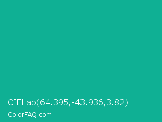 CIELab 64.395,-43.936,3.82 Color is a normal cyan color and the nearest color is Persian Green #00a693. Hex code #0fb094 and RGB value is rgb(15,176,148). In RGB color space, this color is composed of 6% red, 69% green, 58% blue, In CMYK color space, this color is composed of 91% cyan, 0% magenta, 16% yellow , 31% black , In HSL color space, this color has a hue angle of 170° , 84% saturation and 37% lightness.