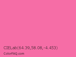 CIELab 64.39,58.08,-4.453 Color is a light rose color and the nearest color is Cyclamen #f56fa1. Hex code #f66da6 and RGB value is rgb(246,109,166). In RGB color space, this color is composed of 96% red, 43% green, 65% blue, In CMYK color space, this color is composed of 0% cyan, 56% magenta, 33% yellow , 4% black , In HSL color space, this color has a hue angle of 335° , 88% saturation and 70% lightness.