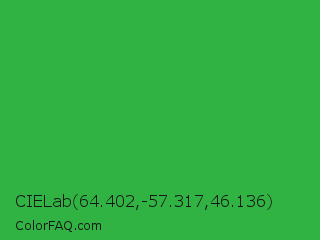 CIELab 64.402,-57.317,46.136 Color is a normal green color and the nearest color is Wageningen Green #34b233. Hex code #31b343 and RGB value is rgb(49,179,67). In RGB color space, this color is composed of 19% red, 70% green, 26% blue, In CMYK color space, this color is composed of 73% cyan, 0% magenta, 63% yellow , 30% black , In HSL color space, this color has a hue angle of 128° , 57% saturation and 45% lightness.