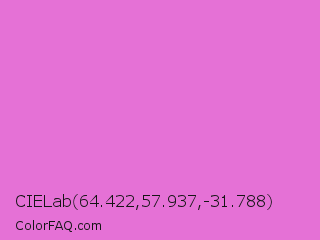 CIELab 64.422,57.937,-31.788 Color is a light magenta color and the nearest color is Orchid #da70d6. Hex code #e571d6 and RGB value is rgb(229,113,214). In RGB color space, this color is composed of 90% red, 44% green, 84% blue, In CMYK color space, this color is composed of 0% cyan, 51% magenta, 7% yellow , 10% black , In HSL color space, this color has a hue angle of 308° , 69% saturation and 67% lightness.