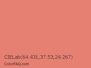 CIELab 64.431,37.53,24.267 Color is a light red color and the nearest color is Middle Red #e58e73. Hex code #e58073 and RGB value is rgb(229,128,115). In RGB color space, this color is composed of 90% red, 50% green, 45% blue, In CMYK color space, this color is composed of 0% cyan, 44% magenta, 50% yellow , 10% black , In HSL color space, this color has a hue angle of 7° , 69% saturation and 67% lightness.