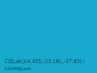 CIELab 64.435,-23.181,-27.831 Color is a normal cyan color and the nearest color is Pacific Blue #1ca9c9. Hex code #17aacd and RGB value is rgb(23,170,205). In RGB color space, this color is composed of 9% red, 67% green, 80% blue, In CMYK color space, this color is composed of 89% cyan, 17% magenta, 0% yellow , 20% black , In HSL color space, this color has a hue angle of 192° , 80% saturation and 45% lightness.