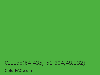 CIELab 64.435,-51.304,48.132 Color is a normal green color and the nearest color is Apple #4fa83d. Hex code #4cb13f and RGB value is rgb(76,177,63). In RGB color space, this color is composed of 30% red, 69% green, 25% blue, In CMYK color space, this color is composed of 57% cyan, 0% magenta, 64% yellow , 31% black , In HSL color space, this color has a hue angle of 113° , 48% saturation and 47% lightness.