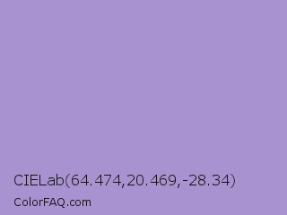 CIELab 64.474,20.469,-28.34 Color is a light violet color and the nearest color is East Side #ac91ce. Hex code #a892cf and RGB value is rgb(168,146,207). In RGB color space, this color is composed of 66% red, 57% green, 81% blue, In CMYK color space, this color is composed of 19% cyan, 29% magenta, 0% yellow , 19% black , In HSL color space, this color has a hue angle of 262° , 39% saturation and 69% lightness.