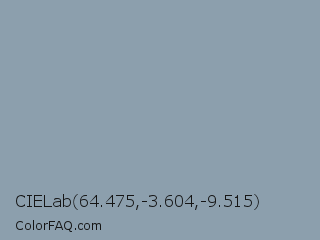CIELab 64.475,-3.604,-9.515 Color is a light blue color and the nearest color is Cadet Grey #91a3b0. Hex code #8c9fad and RGB value is rgb(140,159,173). In RGB color space, this color is composed of 55% red, 62% green, 68% blue, In CMYK color space, this color is composed of 19% cyan, 8% magenta, 0% yellow , 32% black , In HSL color space, this color has a hue angle of 205° , 17% saturation and 61% lightness.
