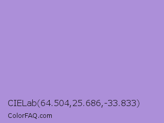 CIELab 64.504,25.686,-33.833 Color is a light violet color and the nearest color is East Side #ac91ce. Hex code #ac8fd9 and RGB value is rgb(172,143,217). In RGB color space, this color is composed of 67% red, 56% green, 85% blue, In CMYK color space, this color is composed of 21% cyan, 34% magenta, 0% yellow , 15% black , In HSL color space, this color has a hue angle of 264° , 49% saturation and 71% lightness.