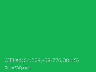 CIELab 64.509,-58.776,38.15 Color is a normal green color and the nearest color is Green Pigment #00a550. Hex code #14b454 and RGB value is rgb(20,180,84). In RGB color space, this color is composed of 8% red, 71% green, 33% blue, In CMYK color space, this color is composed of 89% cyan, 0% magenta, 53% yellow , 29% black , In HSL color space, this color has a hue angle of 144° , 80% saturation and 39% lightness.