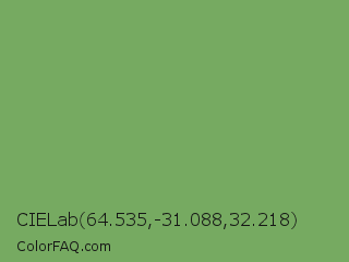 CIELab 64.535,-31.088,32.218 Color is a normal green color and the nearest color is Asparagus Green #7ba05b. Hex code #76aa61 and RGB value is rgb(118,170,97). In RGB color space, this color is composed of 46% red, 67% green, 38% blue, In CMYK color space, this color is composed of 31% cyan, 0% magenta, 43% yellow , 33% black , In HSL color space, this color has a hue angle of 103° , 30% saturation and 52% lightness.