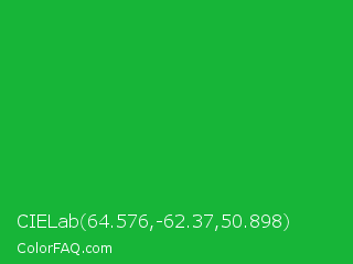 CIELab 64.576,-62.37,50.898 Color is a normal green color and the nearest color is Dark Pastel Green #03c03c. Hex code #17b538 and RGB value is rgb(23,181,56). In RGB color space, this color is composed of 9% red, 71% green, 22% blue, In CMYK color space, this color is composed of 87% cyan, 0% magenta, 69% yellow , 29% black , In HSL color space, this color has a hue angle of 133° , 77% saturation and 40% lightness.