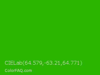 CIELab 64.579,-63.21,64.771 Color is a normal green color and the nearest color is Slimy Green #299617. Hex code #29b500 and RGB value is rgb(41,181,0). In RGB color space, this color is composed of 16% red, 71% green, 0% blue, In CMYK color space, this color is composed of 77% cyan, 0% magenta, 100% yellow , 29% black , In HSL color space, this color has a hue angle of 106° , 100% saturation and 35% lightness.