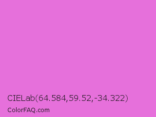 CIELab 64.584,59.52,-34.322 Color is a light magenta color and the nearest color is Orchid #da70d6. Hex code #e670db and RGB value is rgb(230,112,219). In RGB color space, this color is composed of 90% red, 44% green, 86% blue, In CMYK color space, this color is composed of 0% cyan, 51% magenta, 5% yellow , 10% black , In HSL color space, this color has a hue angle of 306° , 70% saturation and 67% lightness.