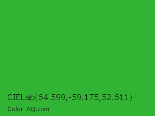CIELab 64.599,-59.175,52.611 Color is a normal green color and the nearest color is Wageningen Green #34b233. Hex code #31b434 and RGB value is rgb(49,180,52). In RGB color space, this color is composed of 19% red, 71% green, 20% blue, In CMYK color space, this color is composed of 73% cyan, 0% magenta, 71% yellow , 29% black , In HSL color space, this color has a hue angle of 121° , 57% saturation and 45% lightness.