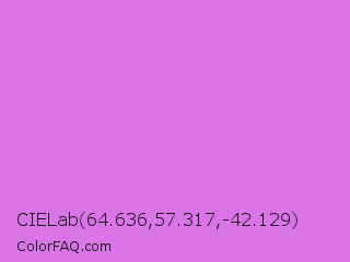 CIELab 64.636,57.317,-42.129 Color is a light magenta color and the nearest color is Orchid #da70d6. Hex code #dc74e9 and RGB value is rgb(220,116,233). In RGB color space, this color is composed of 86% red, 45% green, 91% blue, In CMYK color space, this color is composed of 6% cyan, 50% magenta, 0% yellow , 9% black , In HSL color space, this color has a hue angle of 293° , 73% saturation and 68% lightness.