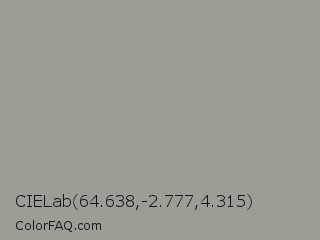CIELab 64.638,-2.777,4.315 Color is a normal green color and the nearest color is Lemon Grass #9b9e8f. Hex code #9b9e95 and RGB value is rgb(155,158,149). In RGB color space, this color is composed of 61% red, 62% green, 58% blue, In CMYK color space, this color is composed of 2% cyan, 0% magenta, 6% yellow , 38% black , In HSL color space, this color has a hue angle of 80° , 4% saturation and 60% lightness.