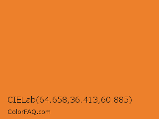 CIELab 64.658,36.413,60.885 Color is a normal orange color and the nearest color is Cadmium Orange #ed872d. Hex code #ed802b and RGB value is rgb(237,128,43). In RGB color space, this color is composed of 93% red, 50% green, 17% blue, In CMYK color space, this color is composed of 0% cyan, 46% magenta, 82% yellow , 7% black , In HSL color space, this color has a hue angle of 26° , 84% saturation and 55% lightness.